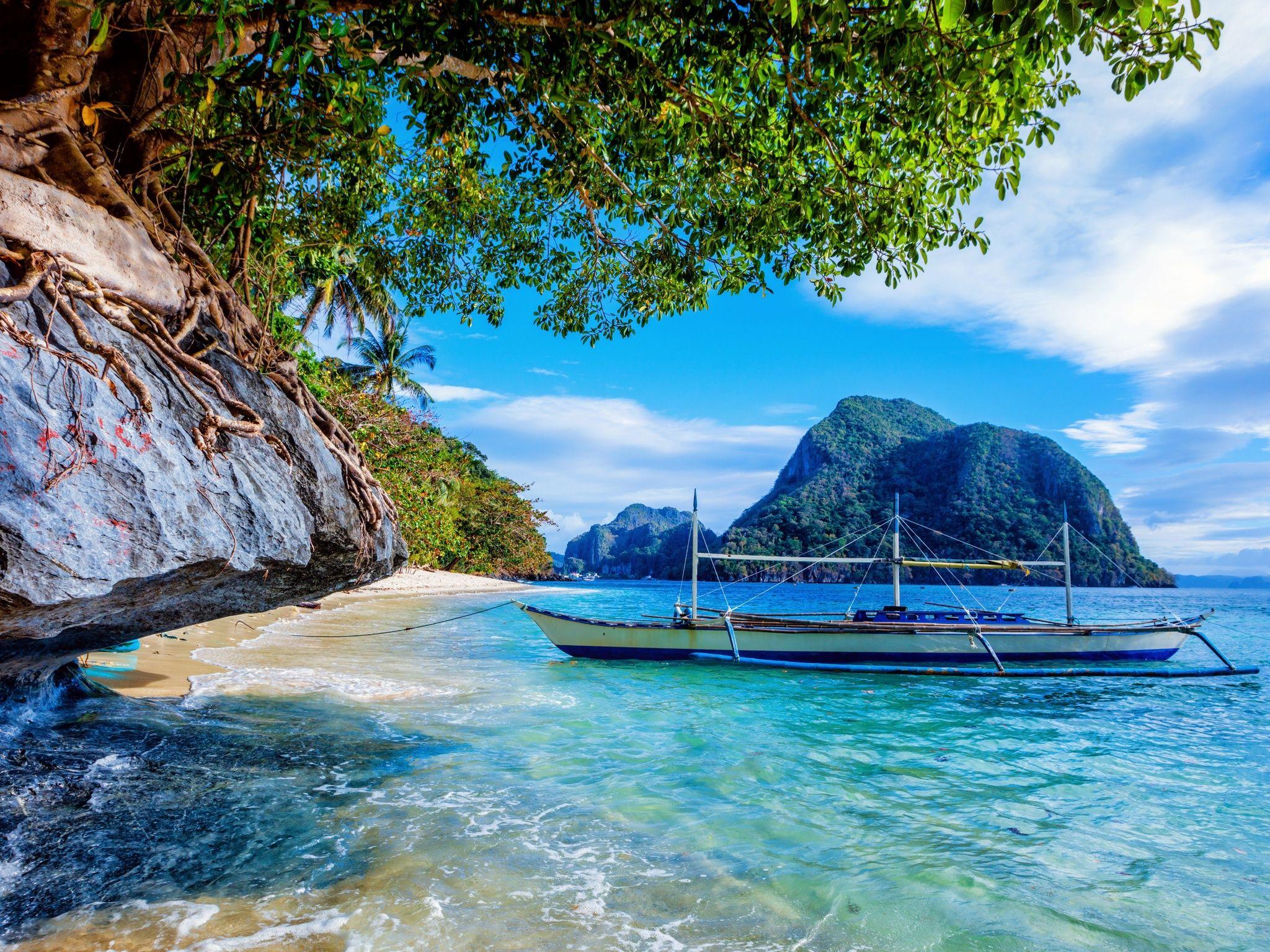 Wallpaper Sand Sea The Sky The Sun Clouds Stones Palm Trees Rocks Coast Boat Philippines Cliffs Palawan Images For Desktop Section Pejzazhi Download